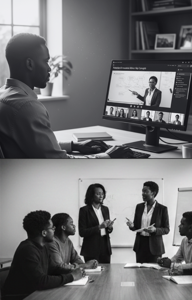 Face-to-face sessions designed for practical learning, open discussion, and real-time feedback. These sessions allow you to ask questions, role-play advice scenarios, and develop confidence in a professional environment.